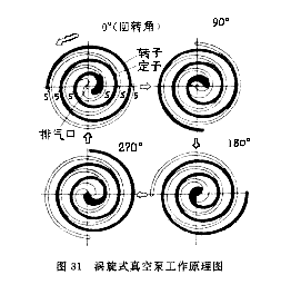 渦旋式無油真空泵是兩條漸開線螺旋曲線盤構(gòu)成,即一個(gè)靜渦旋盤和一個(gè)動(dòng)渦旋盤。動(dòng)渦旋盤作偏心安裝,靜渦旋盤與動(dòng)渦旋盤便形成月芽形腔體。隨著動(dòng)渦旋盤轉(zhuǎn)動(dòng),月芽形腔體不斷向里旋轉(zhuǎn)壓縮,最后從中間排出至出氣口。動(dòng)渦旋盤連續(xù)運(yùn)轉(zhuǎn),氣體不斷從進(jìn)氣口吸入、壓縮,由出氣口排出,形成真空。